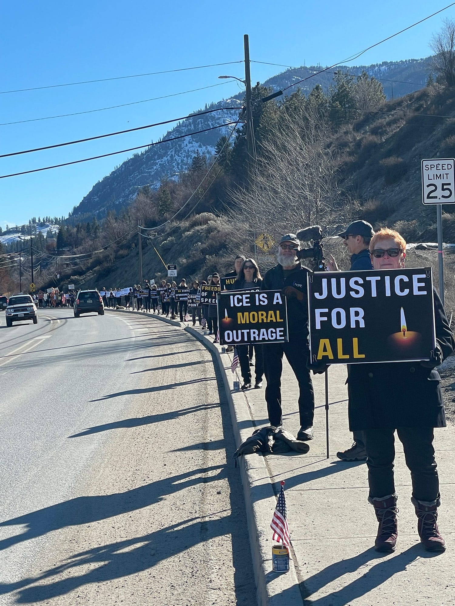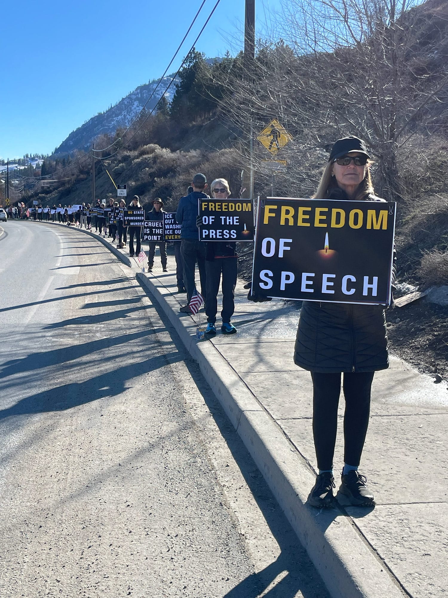 More than 80 people attended the protest in Twisp, many of whom were holding coordinated signs with messages such as ‘Justice for All,’ ‘Freedom of the Press,’ and ‘Free Speech.’ They got a very positive response from drivers on Highway 20. Thirty more citizen protesters showed up to represent our cause in Omak. Yakima Indivisible is thrilled to have so many partners in democracy!