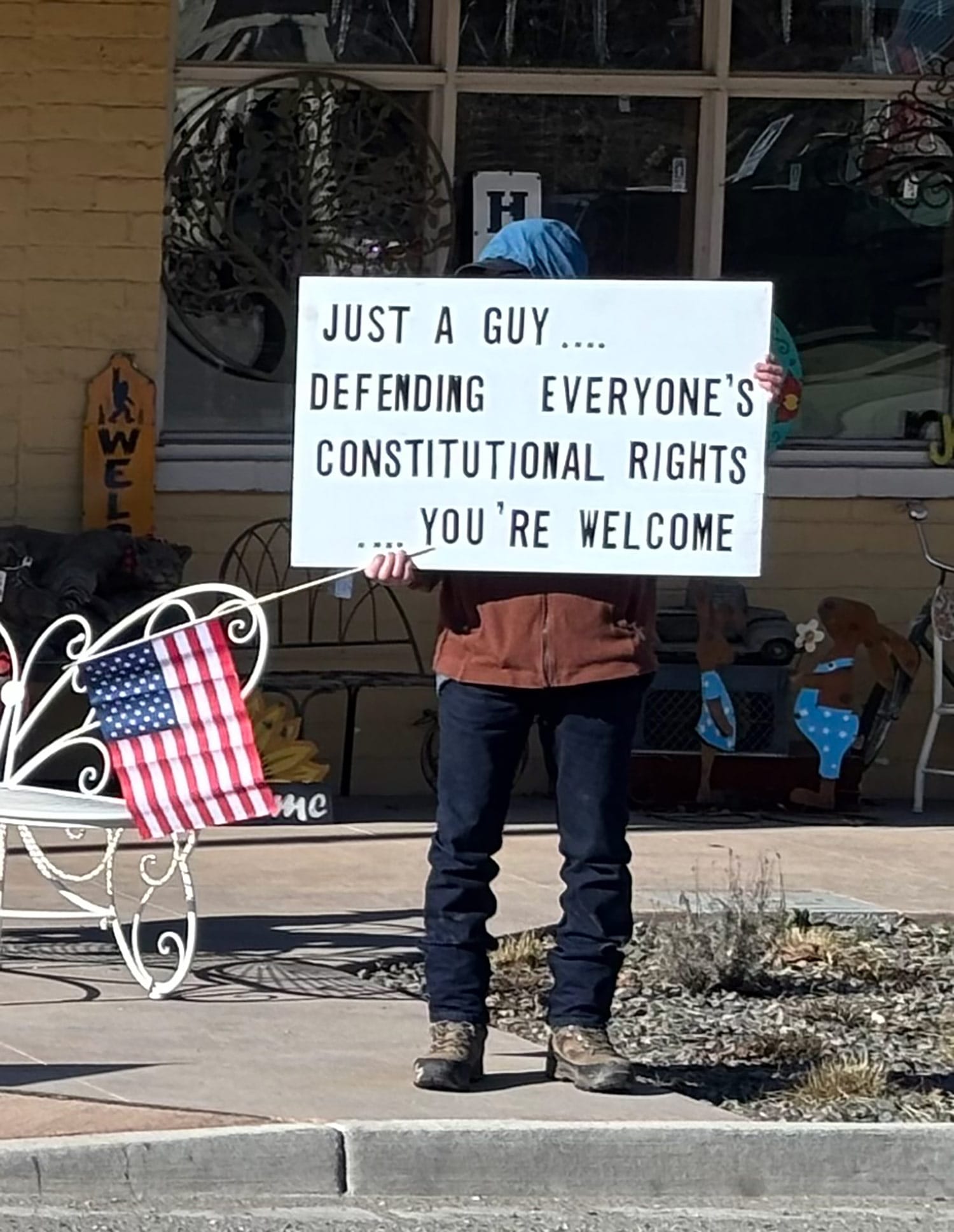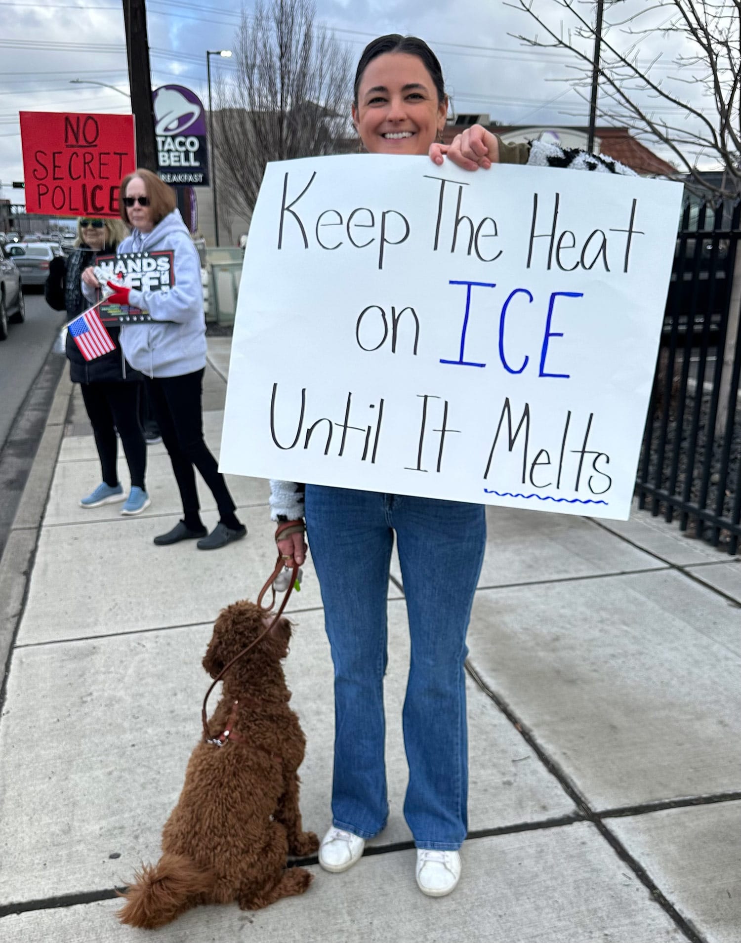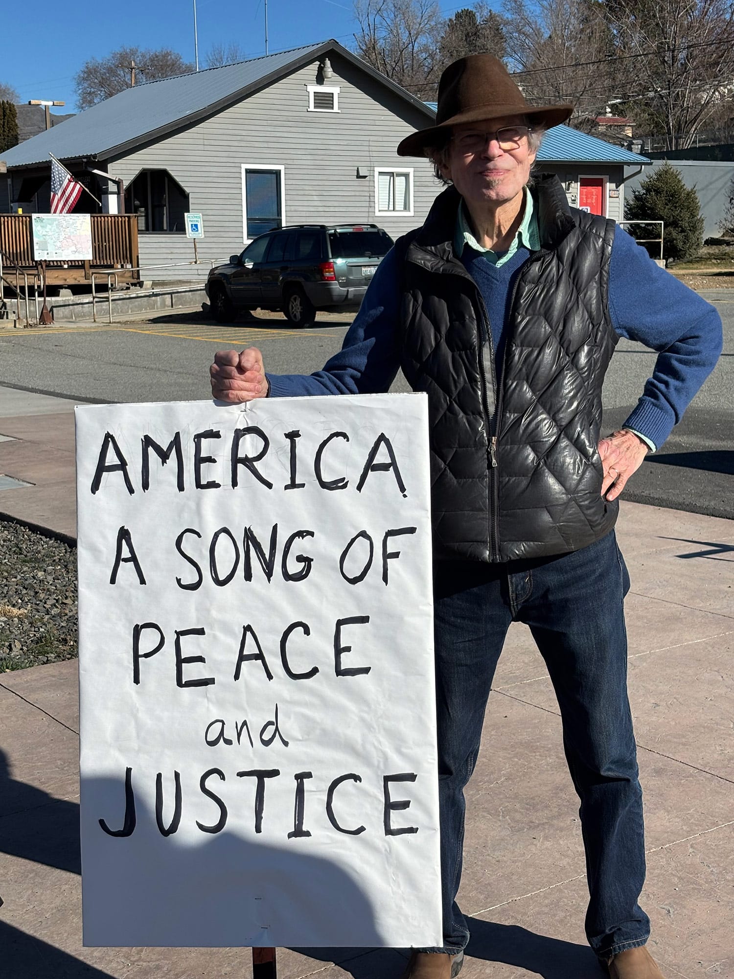 Their gathering was cheerful and optimistic, as protesters sang songs, waved flags, and cheered when cars driving by honked their horns. One local business brought out hot coffee and cookies. Participants said it was inspiring that throughout our nation, people are recognizing that this administration is moving us in the wrong direction.