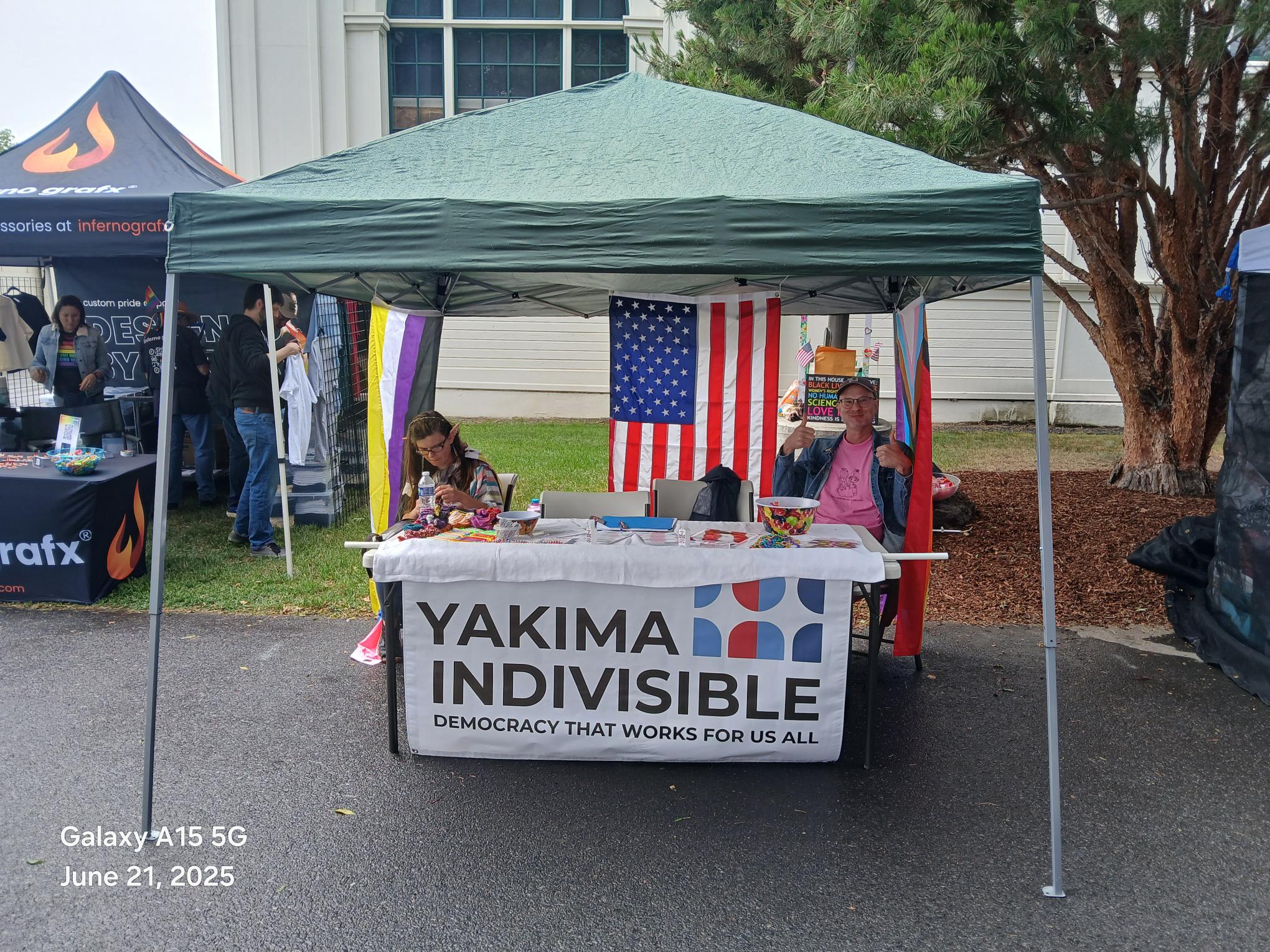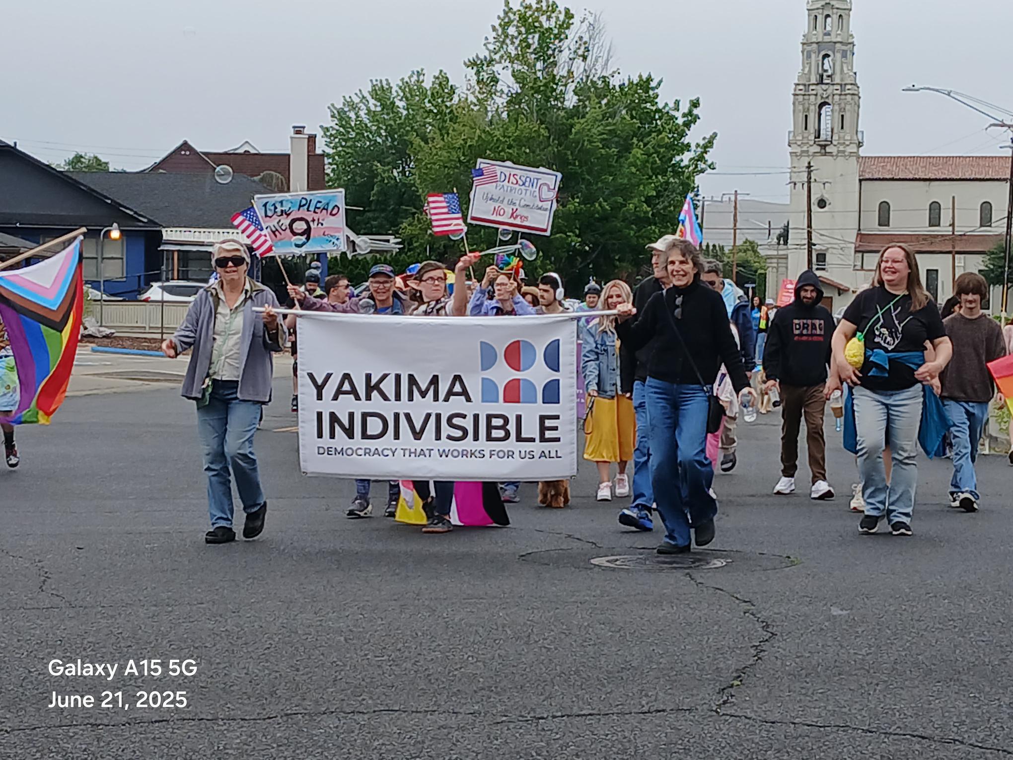 “Juneteenth and Pride were the first two events we felt we could dig into (by) offering our support and getting our name/faces out in the community as Yakima Indivisible,” she said. “We staffed the Juneteenth table with pairs of sitters, so we had a total of 10 people sign up. For the Pride Parade, we had about 40 people behind our banner on a cold, rainy Saturday so, not a bad turnout.”